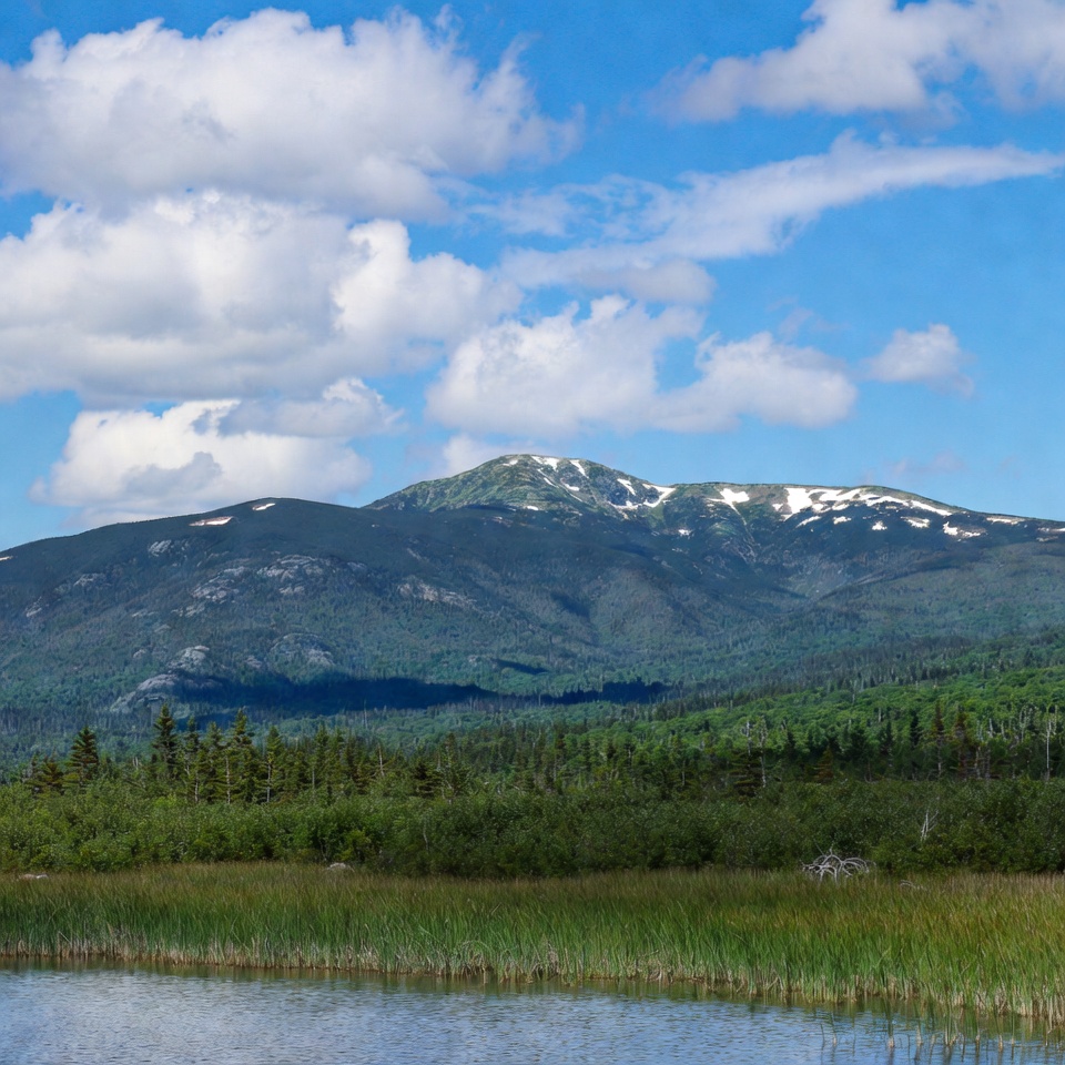 alpine, blue sky, clouds, coniferous, evergreen trees, forest, grass, green trees, hills, lake, landscape, marsh, nature, outdoors, peak, pristine, reeds, reflection, scenery, sky, snow-capped, snowy mountain, vegetation, water, wilderness, mountain
