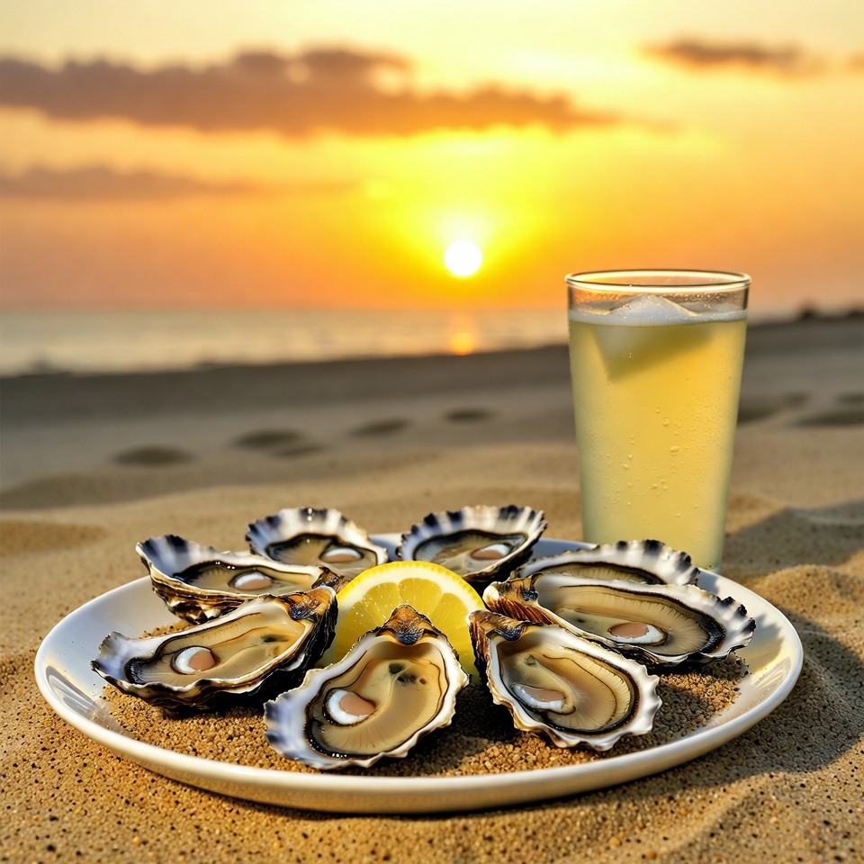 A white plate of fresh oysters garnished with lemon sits on sandy beach. A tall glass of light beer stands beside it. Vibrant orange sunset glows over the ocean in the background.