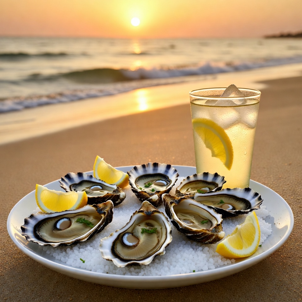 A white plate of fresh oysters garnished with lemon slices and parsley sits on sandy beach. A tall glass of iced lemon water with lemon wedge stands beside it. The scene is set against ocean waves and a vibrant orange sunset.