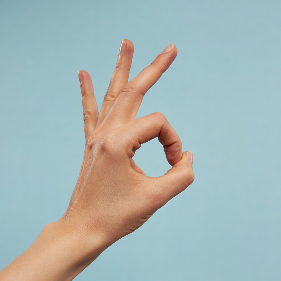 A close-up of a woman's hand forming the OK gesture with thumb and index finger circled, and other fingers extended. The hand is positioned against a solid light blue background. Nails are unpainted and neatly manicured.
