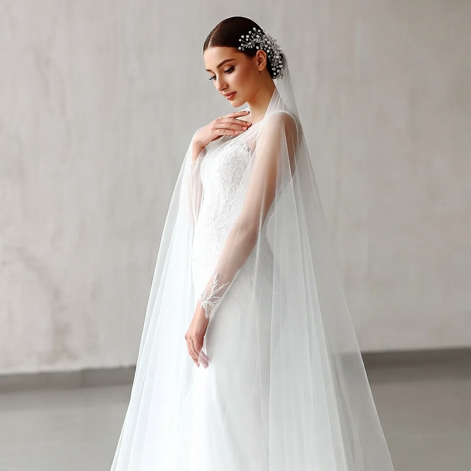 A woman with dark hair styled in an updo adorned with beads wears a white lace wedding dress with long sheer sleeves. She has a flowing veil draped over her head and stands sideways against a plain gray background. Her hand touches her neck gently.