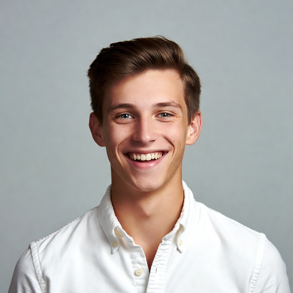 A young man with short brown hair smiles broadly at the camera against a plain gray background. He has bright blue eyes and wears a white collared shirt with the top button undone. His expression is cheerful and engaging.