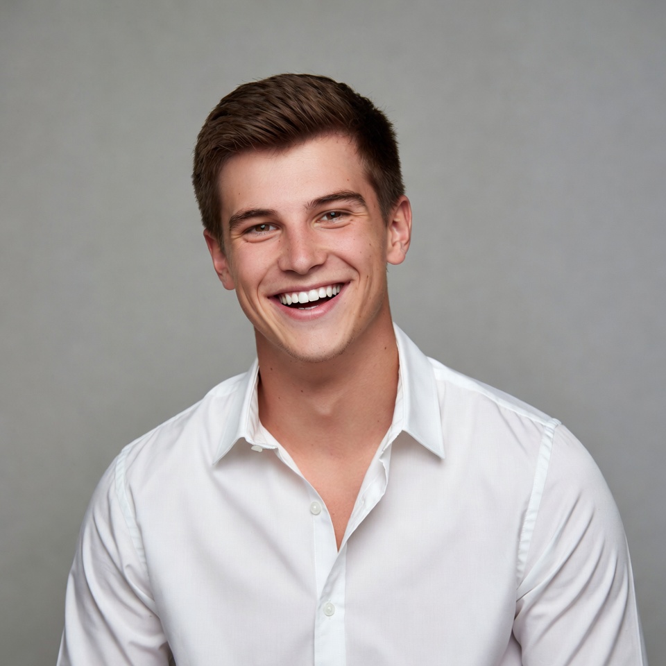 A young man with short brown hair smiles broadly at the camera against a plain gray background. He wears a white collared shirt with the top buttons undone. His expression is cheerful with bright eyes and white teeth visible.