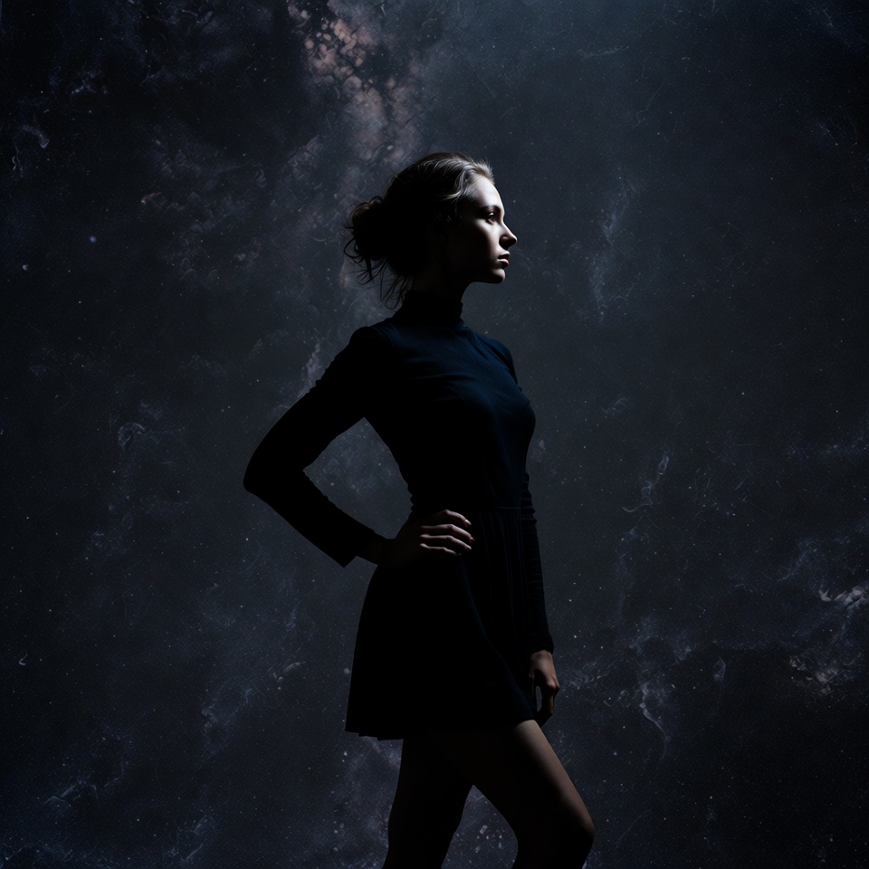 A young woman stands in profile silhouette wearing a black turtleneck dress with her hair in a bun. She poses confidently with one hand on her hip against a dark cosmic background filled with stars and nebulae. Her legs are slightly apart, emphasizing a poised stance.