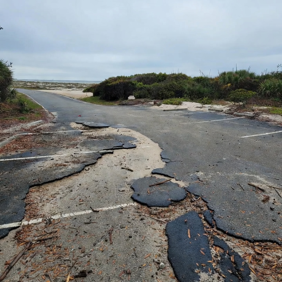 asphalt damage, beach access, beach parking, broken pavement, coastal road, damaged asphalt, erosion damage, gray sky, nature path, ocean view, outdoor scene, overcast sky, parking lot, potholes, road cracks, sand dunes, sandy beach, sea oats, seaside landscape, cracked road