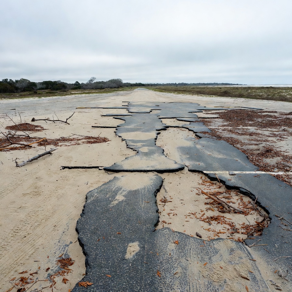 asphalt, beach road, branches, cloudy sky, cracks, damaged pavement, debris, dirt road, erosion, isolated background, landscape, leaves, nature, overcast, pathway, road damage, rural road, sand, sandy beach, cracked road