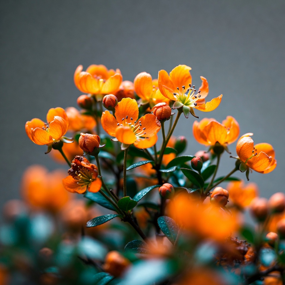 bloom, close-up, flower buds, flower cluster, flowers, gray background, green leaves, isolated background, macro photography, nature, orange blossoms, petals, plant, stems, vibrant orange, water droplets, yellow centers, orange flowers