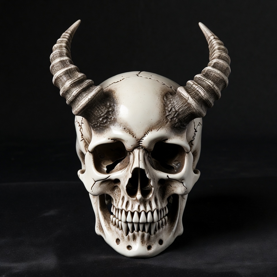 Halloween, bone, cracks, curved horns, dark background, decoration, demonic, eye sockets, fangs, gothic, horns, horror, isolated background, macabre, prop, sculpted skull, skull, supernatural, white skull, demon skull