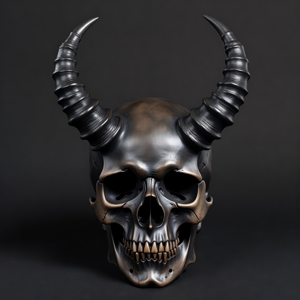 A detailed demonic skull features large, curved black horns protruding from the top. The skull has a metallic bronze and black finish with prominent teeth and empty eye sockets. It is centered against a solid black background.