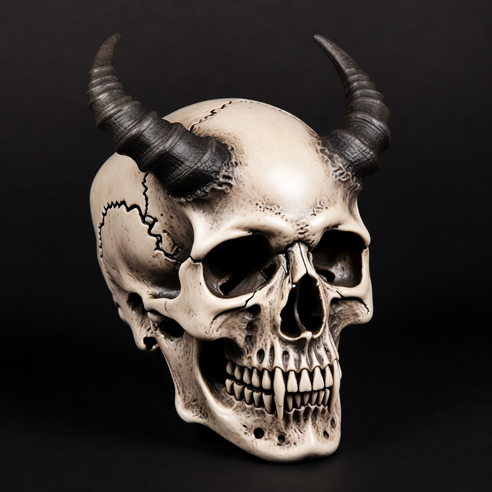 Halloween, black horns, bone cracks, curved horns, dark background, demon, devil skull, fangs, fantasy skull, gothic, grinning skull, horns, horror, isolated background, macabre, prop, skull, supernatural, white skull, demon skull