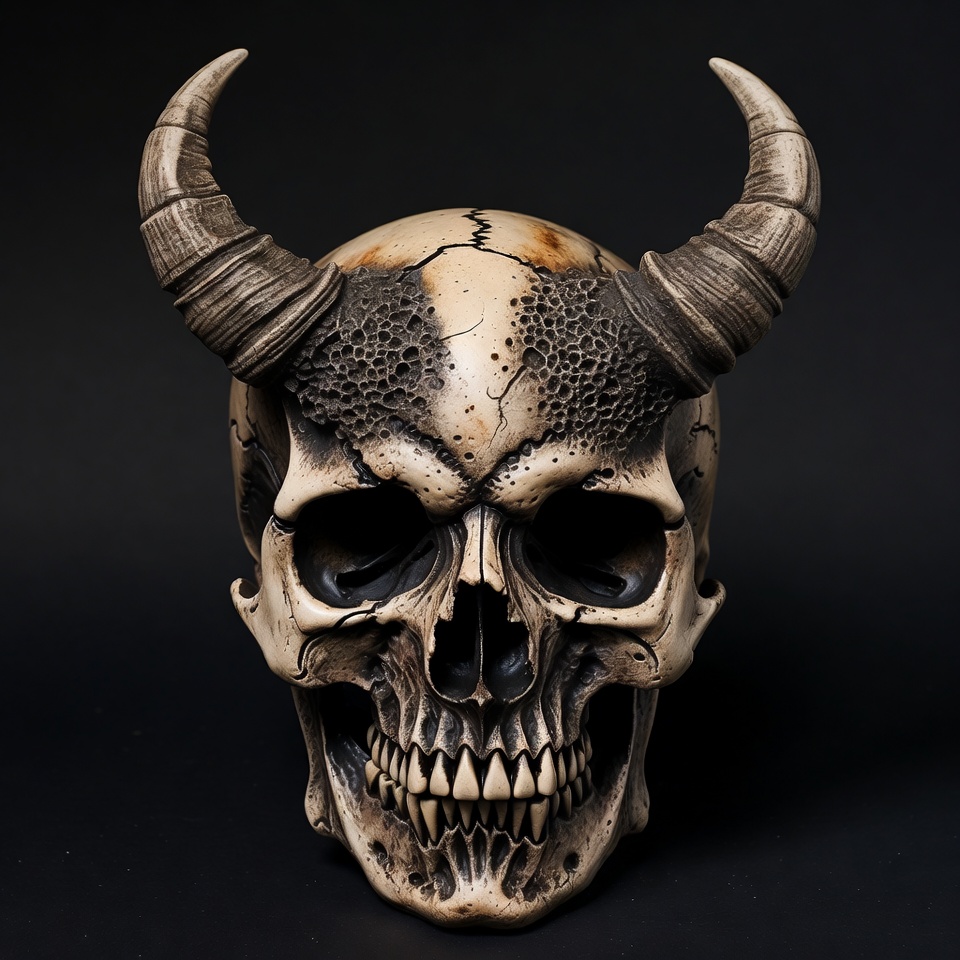 Halloween skull, beige skull, black background, brown horns, ceramic skull, cracked skull, curved horns, demon skull, devil skull, fantasy skull, gothic skull, horns, horror skull, isolated background, prop skull, sculpture, sharp teeth, skull, skull sculpture, demonic skull