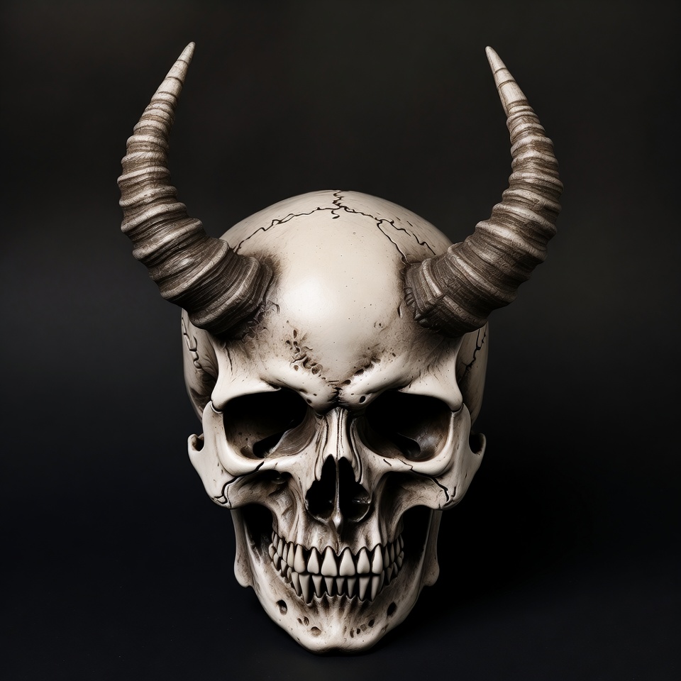A white human skull with large curved demonic horns protrudes from the top. The skull features detailed cracks and teeth, set against a solid black background. It has a realistic 3D rendered appearance.