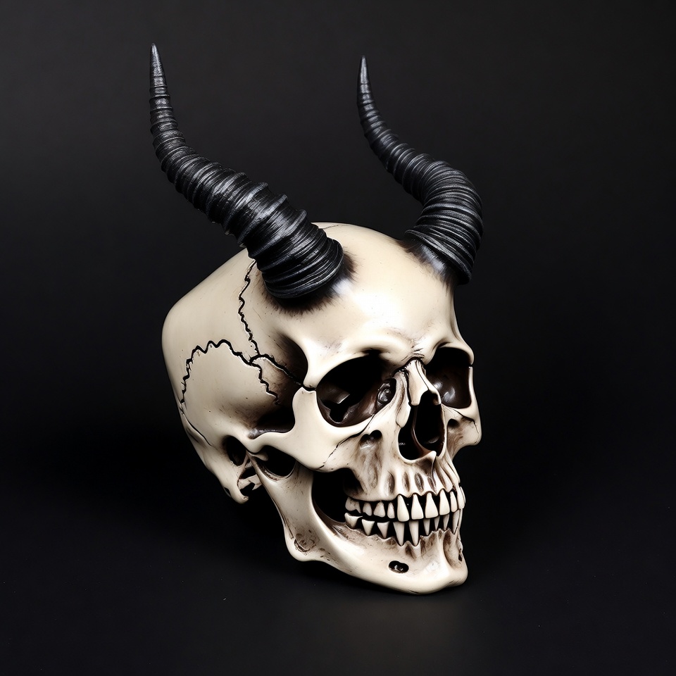 Halloween, black horns, bones, cracked skull, curved horns, death, demon, fantasy, gothic, grinning skull, horns, horror, isolated background, macabre, prop, skull, white skull, demon skull