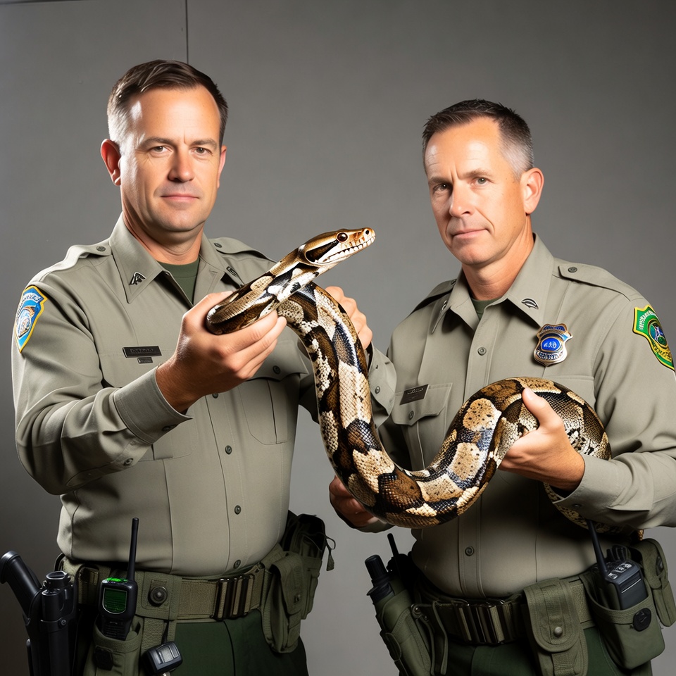 White, animal, badges, boa constrictor, gray background, green uniforms, holding snake, male, park rangers, radios, rangers, reptile, snake, two men, uniforms, utility belts, men