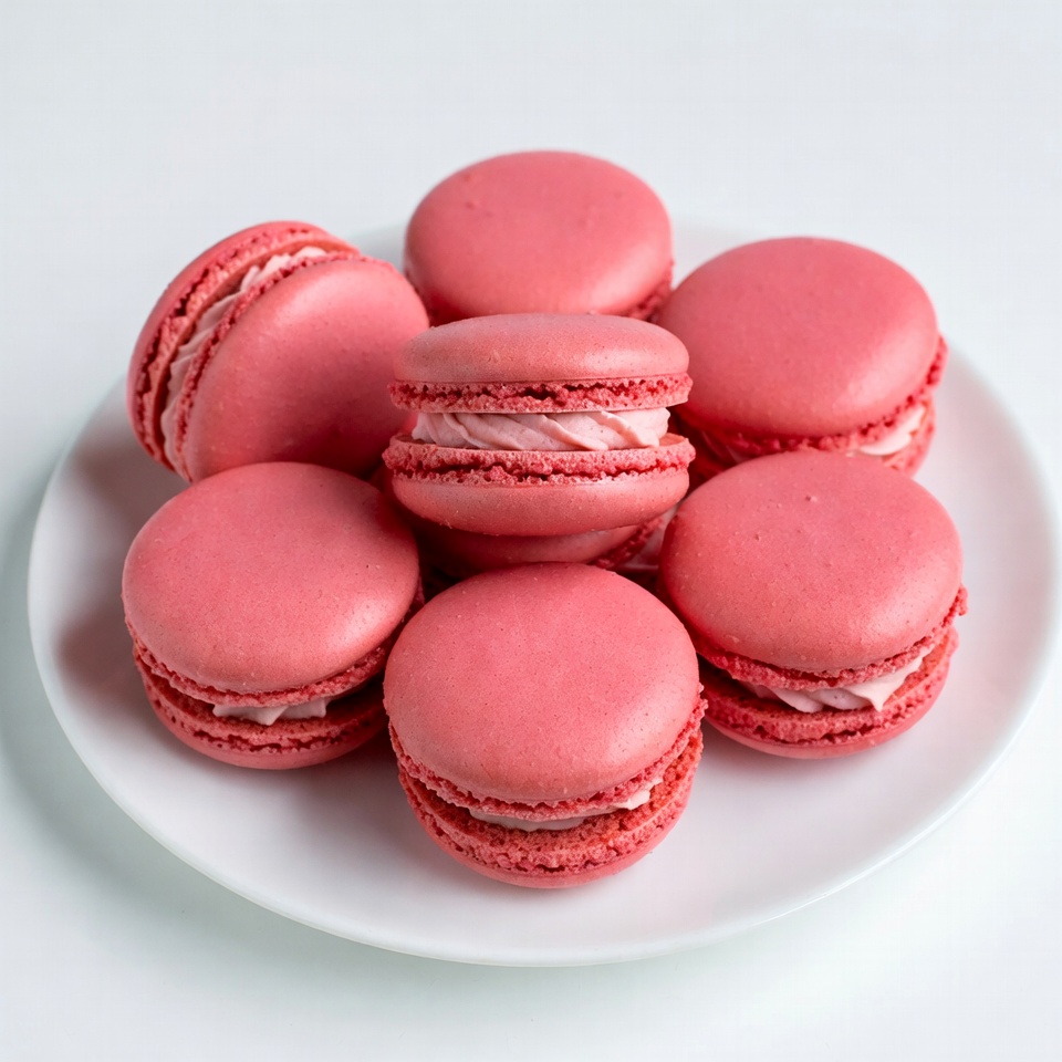 French macarons, baked goods, confections, cookie stack, dessert plate, elegant dessert, food photography, gourmet dessert, macaron pile, macaron stack, pastries, patisserie, pink dessert, pink filling, pink macarons, pink treats, round cookies, sweets, white plate, macarons