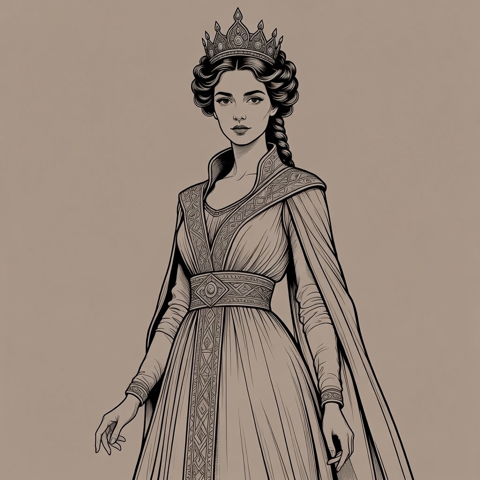 A detailed line art illustration depicts a woman with long wavy hair styled in braids, wearing an ornate crown and a flowing medieval gown with intricate embroidery and a wide belt. She stands gracefully with her hands gently clasped in front, posed against a plain beige background. The artwork features bold black ink lines on a tan backdrop, emphasizing her regal attire and poised stance.