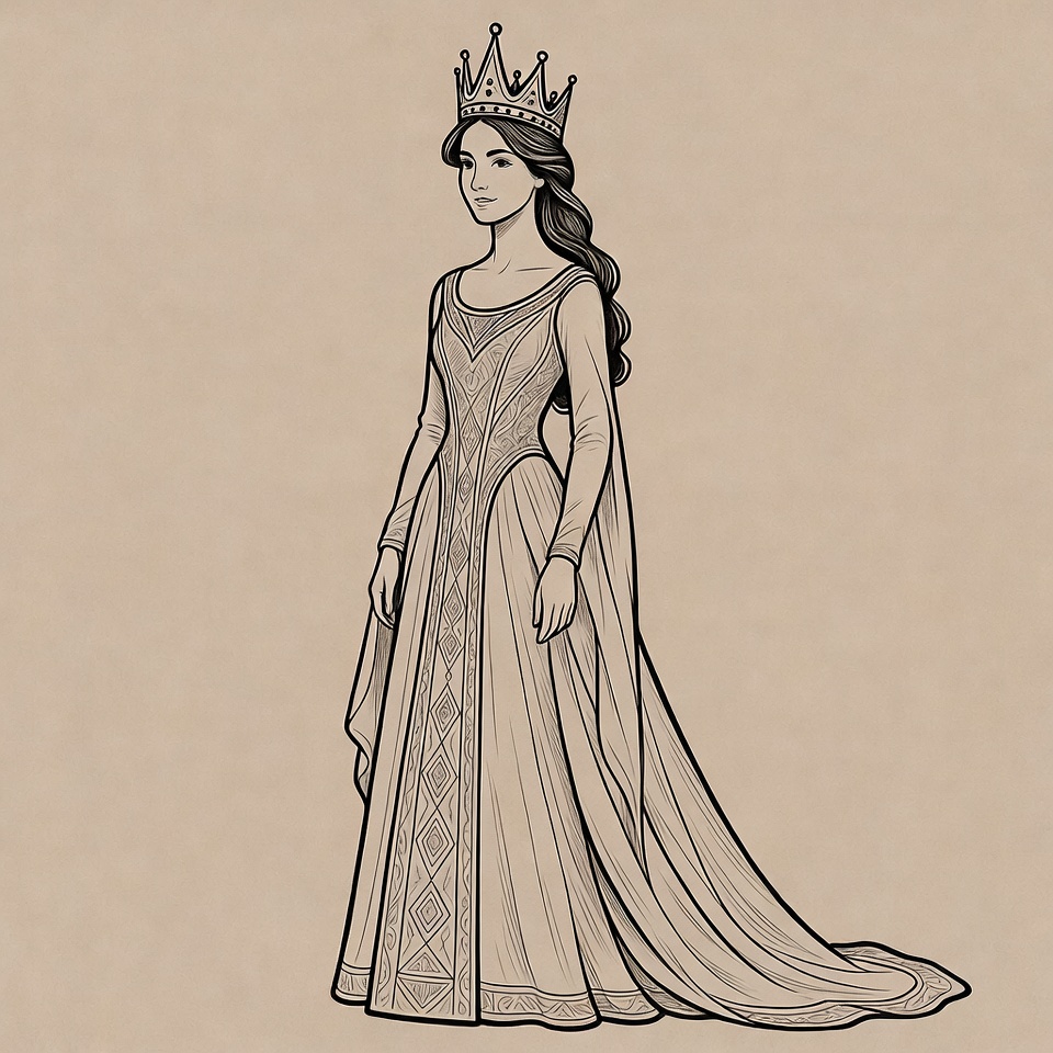 Line art illustration of a regal woman wearing an ornate crown and long medieval gown with intricate patterns. She stands gracefully with long wavy hair cascading over her shoulders and a flowing train on her dress. The image features a simple beige background.