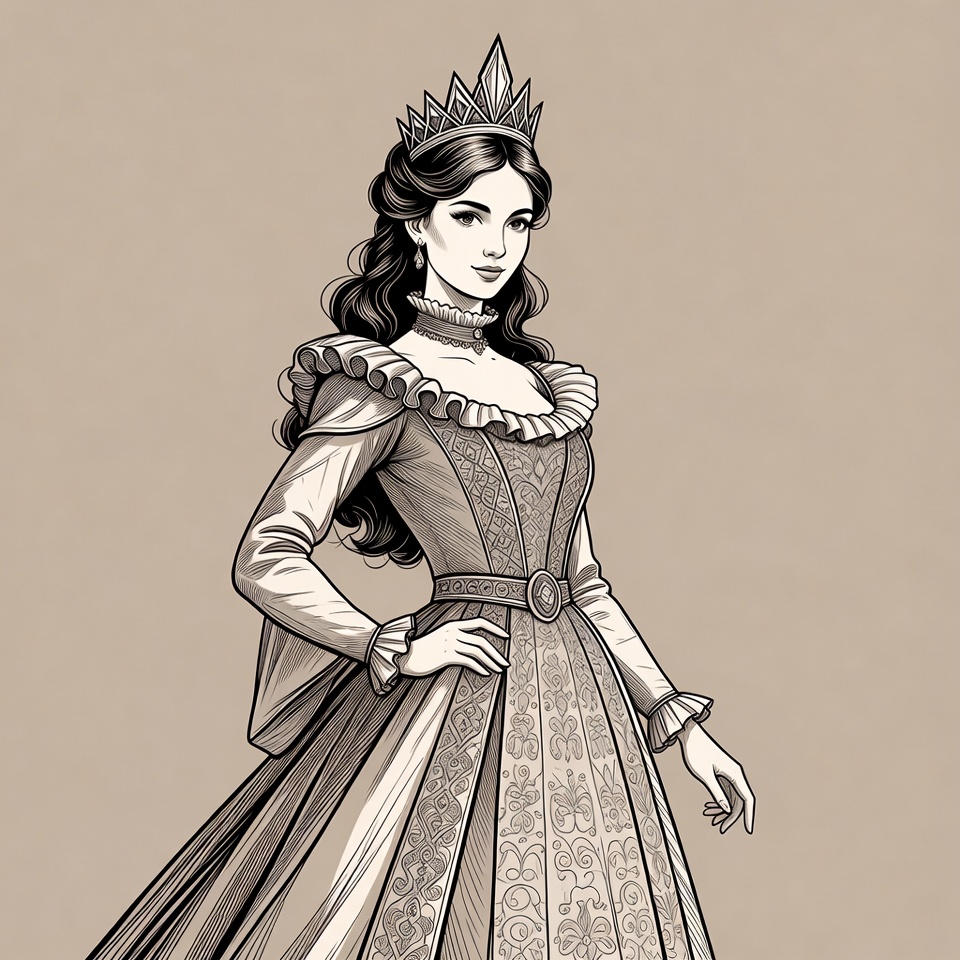 Renaissance, White, beige background, crown, detailed drawing, dress, elegant woman, embroidered gown, fantasy princess, female, gown, historical fashion, illustration, jewelry, line art, long hair, ornate dress, portrait, puffed sleeves, royal attire, ruffled collar, standing pose, vintage style, wavy hair, woman, princess