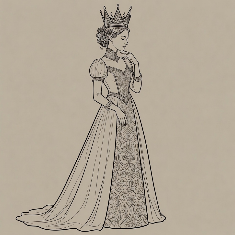 Line art illustration of a woman wearing an ornate crown and Victorian-style gown with puffed sleeves and intricate lace details. She stands in profile with her hand thoughtfully touching her chin. The design features a long flowing skirt on a plain background.