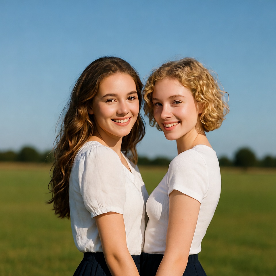 White, arms linked, blonde hair, blue sky, brown hair, curly hair, female, friends, grass, green field, happy faces, nature, navy skirts, outdoor, portrait, sisters, smiling girls, two girls, wavy hair, white blouses, young girls, girls