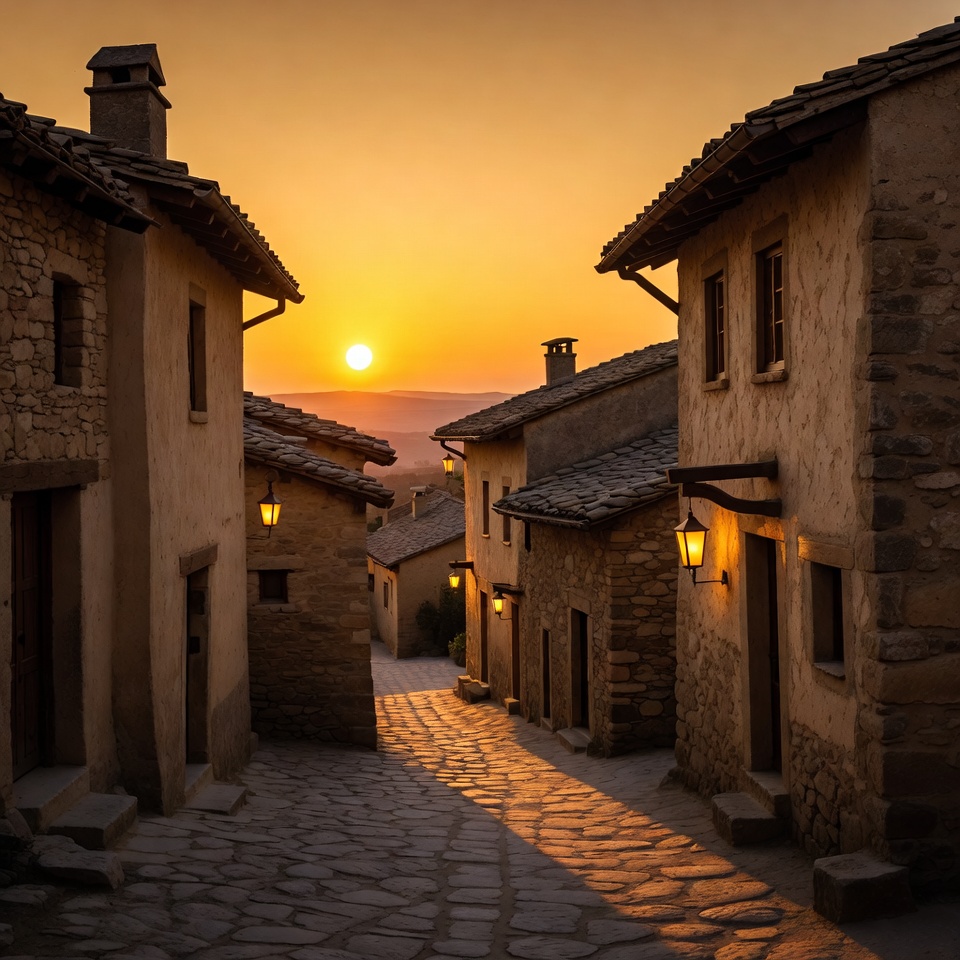 A narrow cobblestone street winds through stone houses with terracotta roofs in a quaint European village. The golden sunset illuminates the facades, casting long shadows on the pathway. Lanterns hang from the walls, and the sun dips behind distant hills.