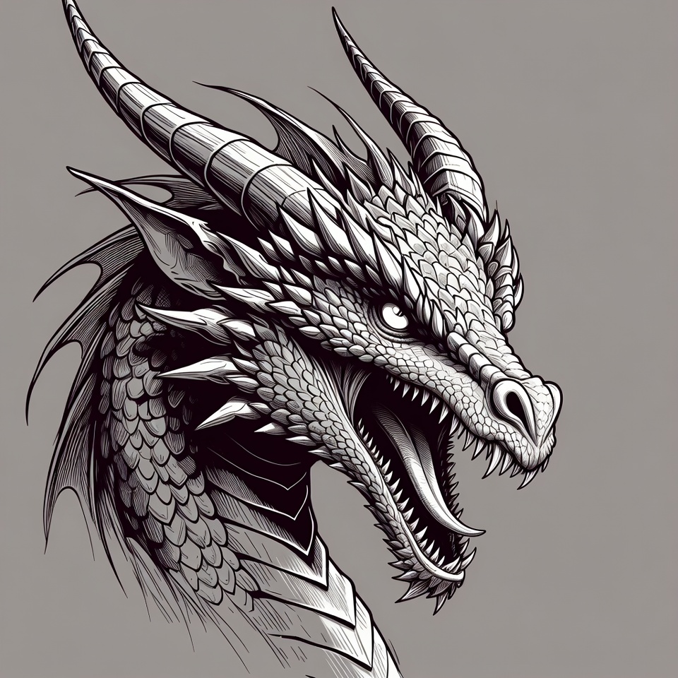 detailed drawing, dragon head, dragon illustration, fantasy creature, fierce dragon, grayscale, horns, illustration, isolated background, line art, mythical beast, red eyes, roaring dragon, scales, sharp teeth, snarling dragon, wings, dragon