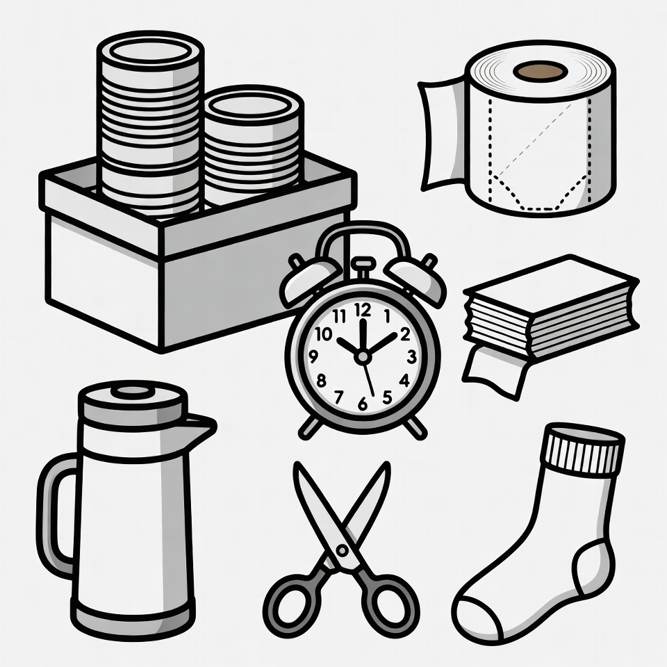 Line art clipart illustration features a stack of plates in a box, toilet paper rolls, an alarm clock showing time, a thermos jug, scissors, stacked paper, and a sock. All items are depicted in simple black outlines on a white background. The objects are arranged loosely together without overlapping.