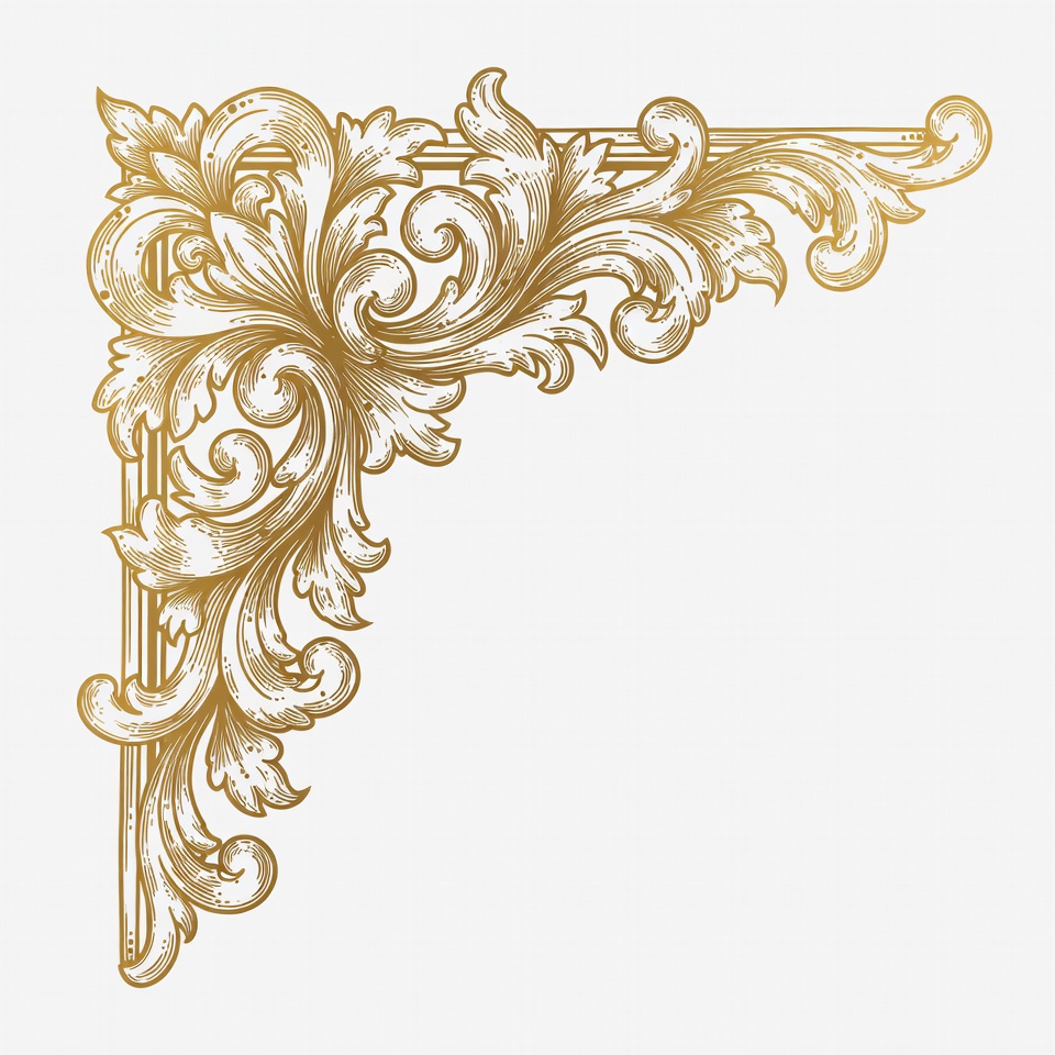 artistic border, baroque style, clipart, decorative corner, elegant design, embellishment, floral border, foliage motif, gold filigree, golden ornament, graphic element, illustration, line art, ornate design, scrollwork, swirling foliage, vector graphic, vintage border, white background, corner border