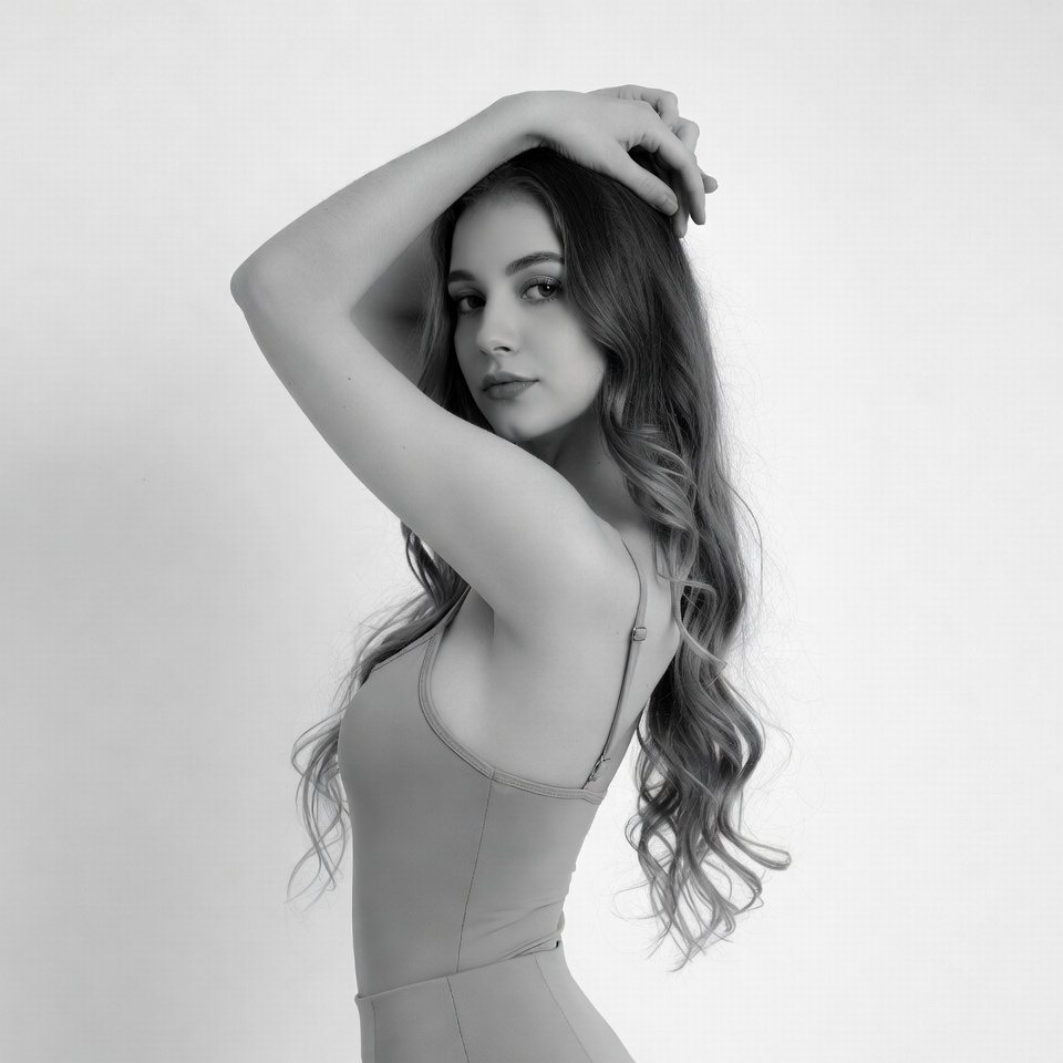A young woman with long wavy hair poses sideways against a white background in black and white photography. She wears a form-fitting tank top and raises one arm with her hand resting on her head. Her expression is neutral with lips slightly parted.
