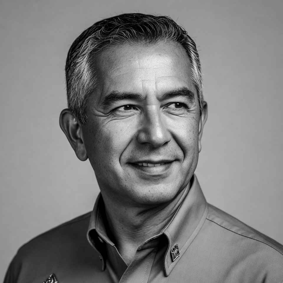 A middle-aged man with short gray hair smiles slightly while looking to the side. He wears a light-colored button-up shirt with a collar pin against a plain gray background. The black-and-white portrait highlights his facial features and subtle expression.