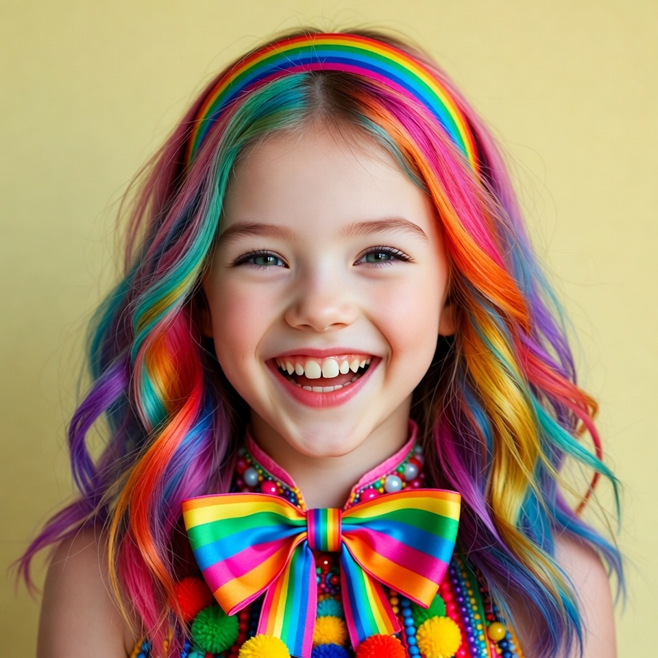 A young girl with vibrant rainbow-colored wavy hair smiles happily at the camera against a bright yellow background. She wears a large rainbow bow tie and multicolored bead necklace with pom poms. Her blue eyes sparkle as she displays her bright smile.