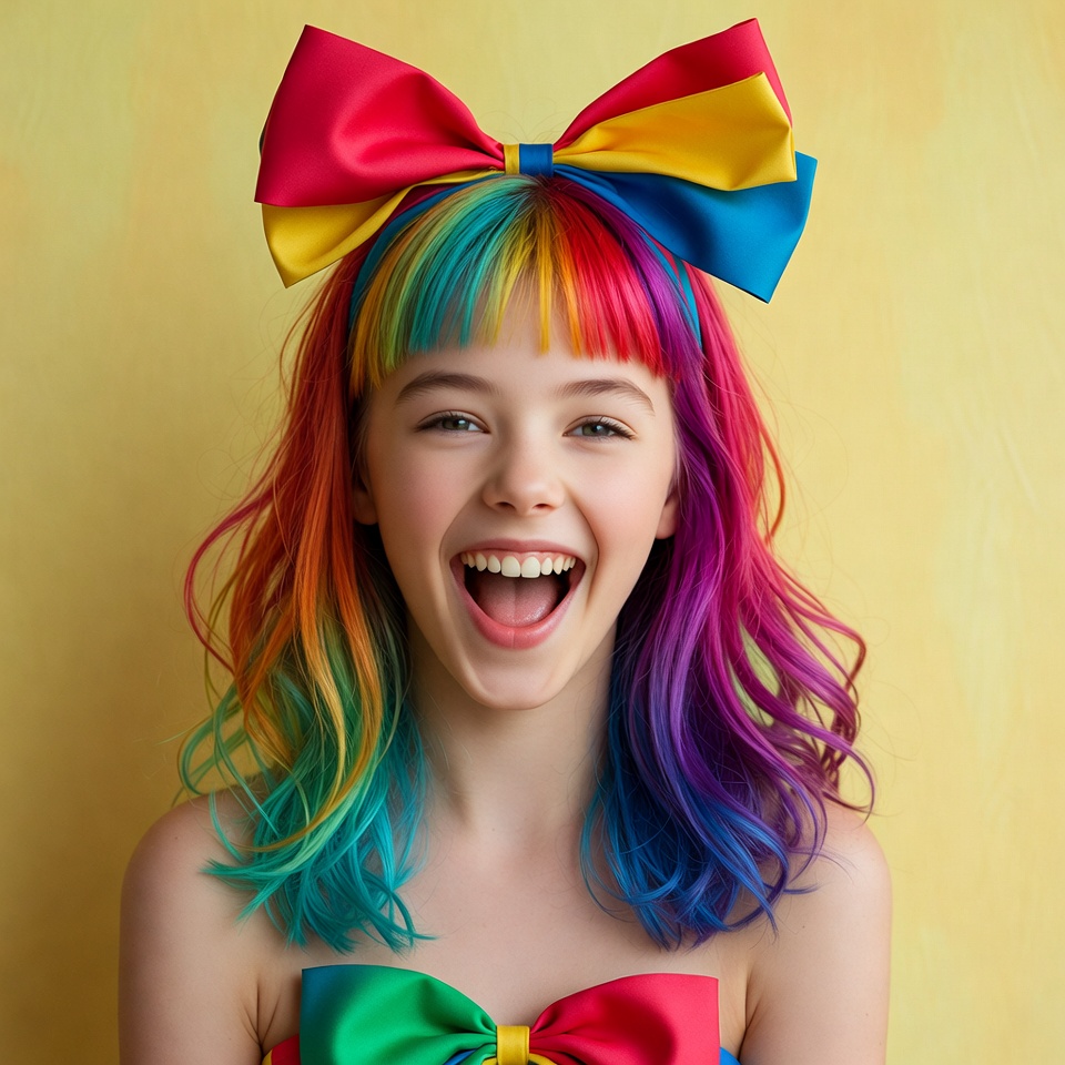 White, big bow, blue hair, colorful hair, female, green bow, happy girl, isolated background, multicolored bow, pink hair, rainbow hair, smiling girl, vibrant hair, wide smile, yellow background, young girl, girl