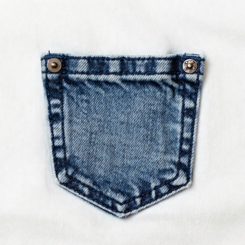 A close-up view of a blue denim jeans pocket on a white background. The pocket features stitched edges, a flap with two silver rivets, and frayed denim texture. It is isolated for clear visibility.