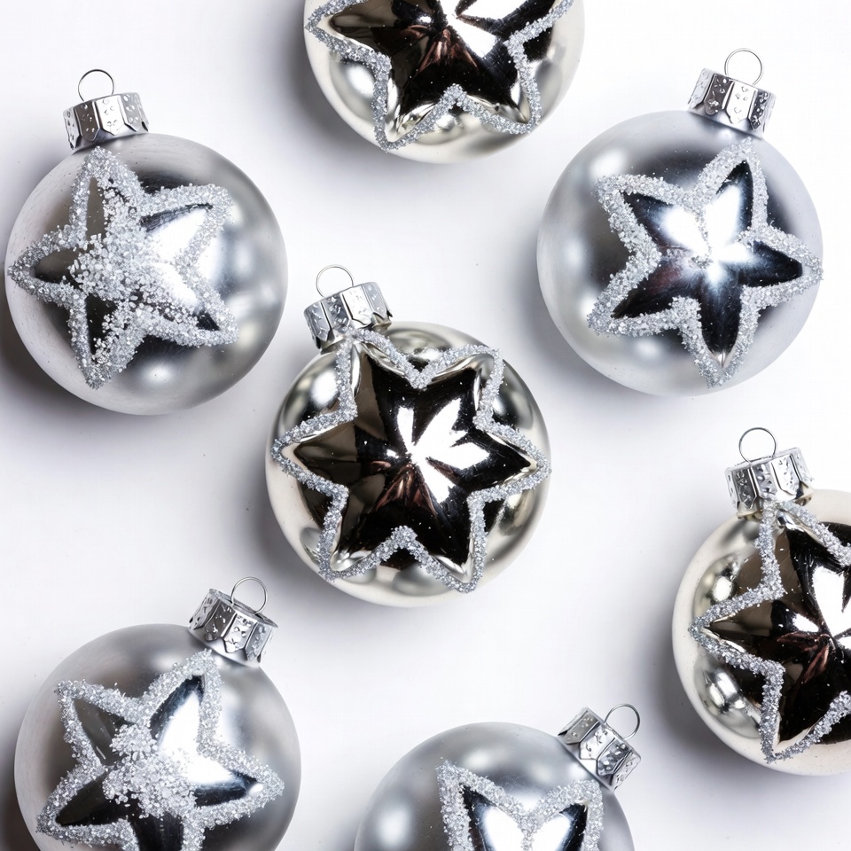 Christmas balls, festive decor, glittery texture, holiday decorations, holiday spheres, metallic stars, ornament collection, shiny balls, silver baubles, silver ornaments, star baubles, star design, white background, winter decor, Christmas ornaments