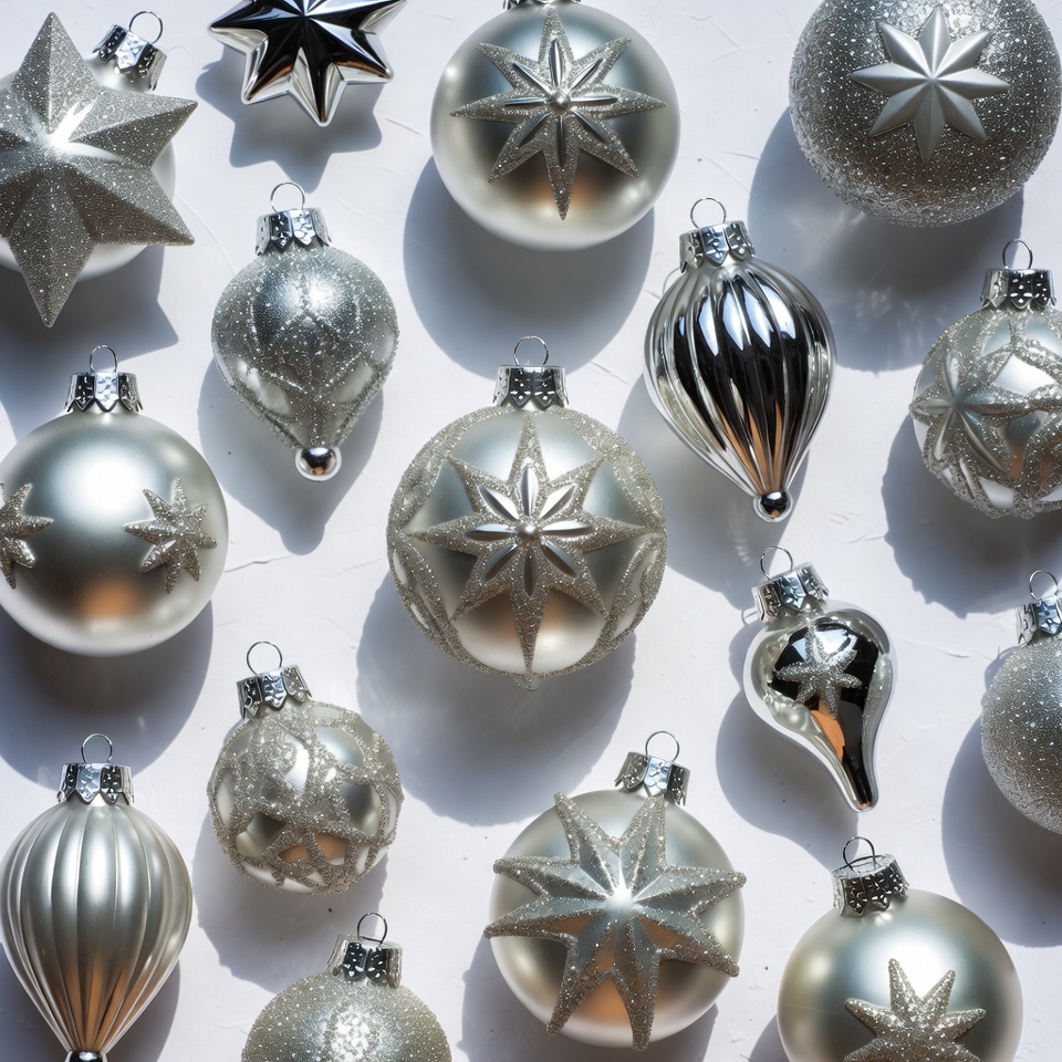 A collection of shiny silver Christmas ornaments in various shapes including balls, stars, and teardrops is arranged on a white surface. They feature glittery textures and metallic finishes with subtle shadows beneath. Hooks are attached to many of the ornaments.