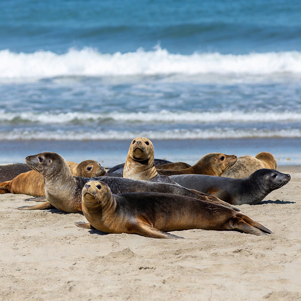 Sea lions resting on the beach in a coastal habitat