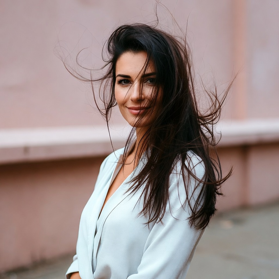 White, beautiful woman, brunette, closeup, dark hair, female, flowing hair, hair blowing, long hair, natural light, outdoor, pavement, pink wall, portrait, smiling, v-neck blouse, white blouse, windblown hair, woman