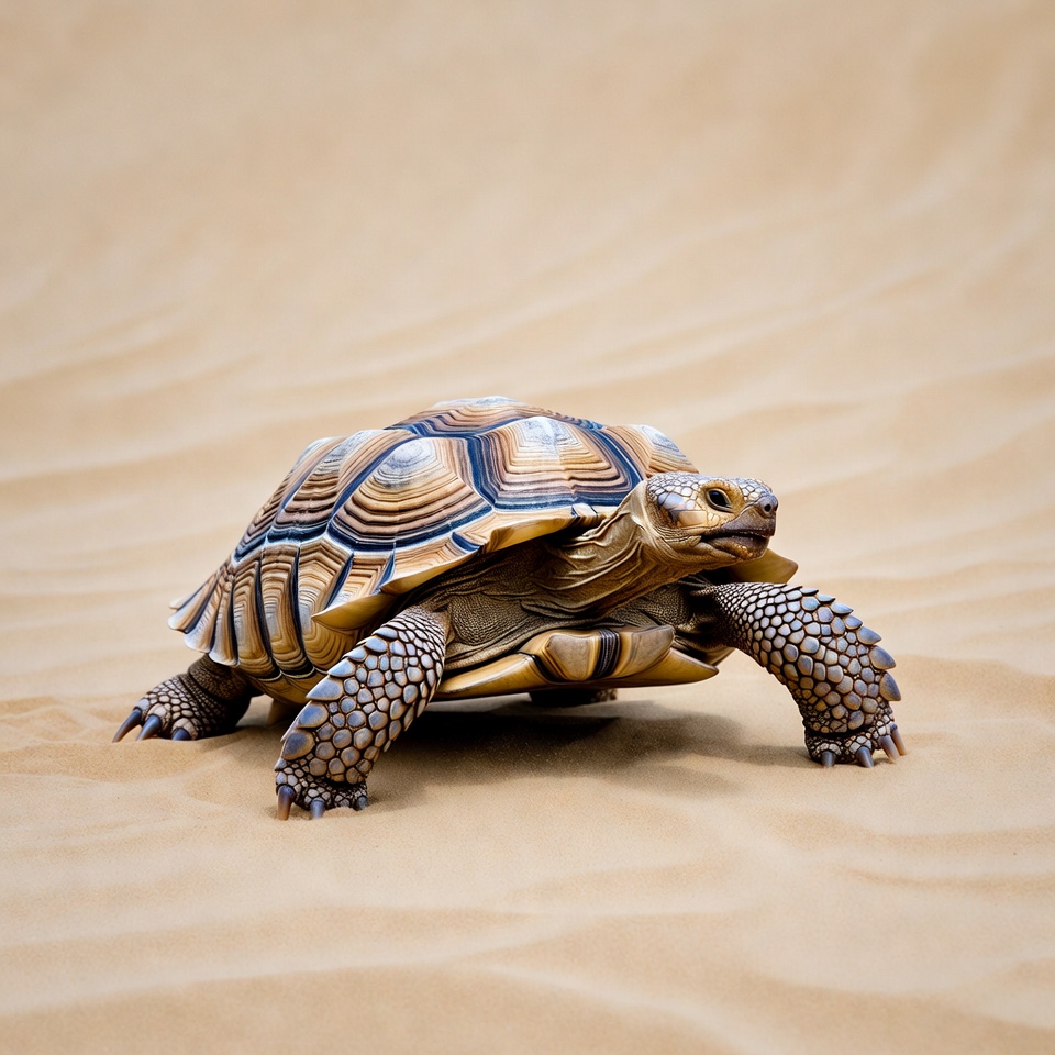 A radiated tortoise with intricate brown and blue-striped shell walks on a sandy desert surface. Its head is extended forward with a focused expression, and its sturdy legs are visible against the fine beige sand. The tortoise is centered in the frame with a blurred sandy background.