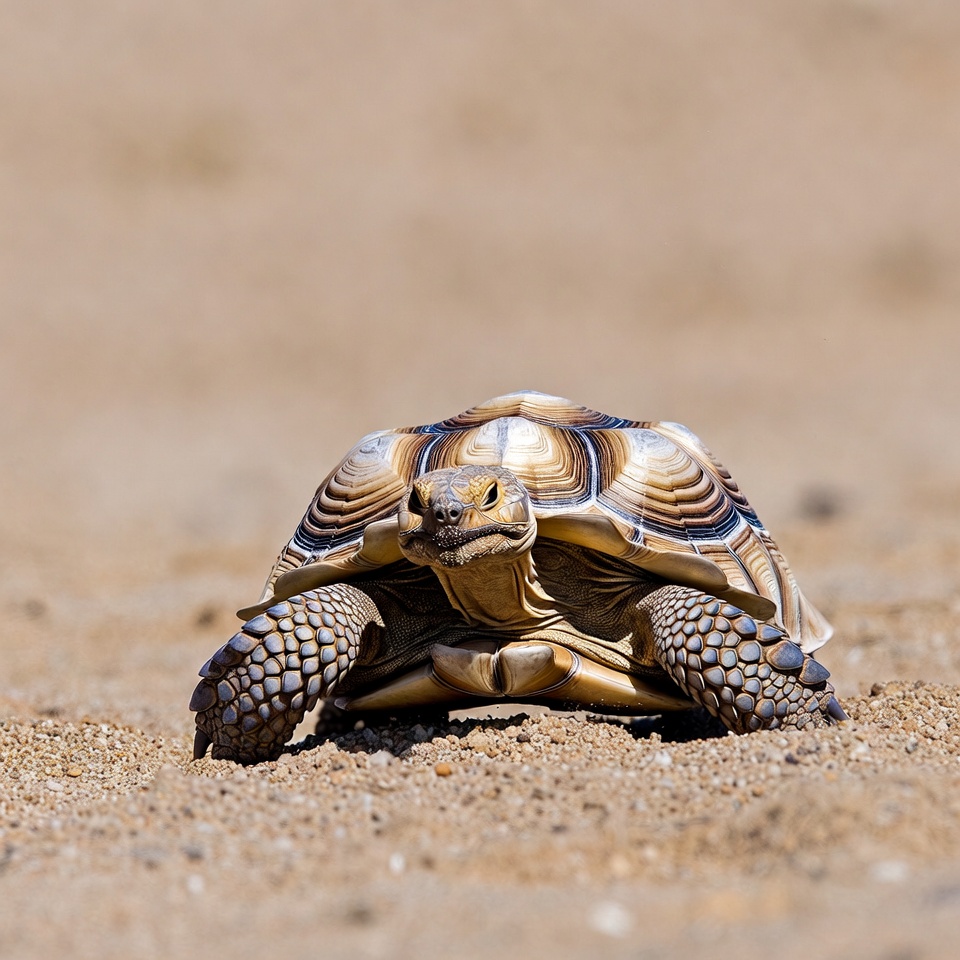 A Sulcata tortoise with a patterned brown and yellow shell faces forward on a sandy desert ground. Its head is extended with a determined expression, and textured legs are visible. The background is blurred arid sand.