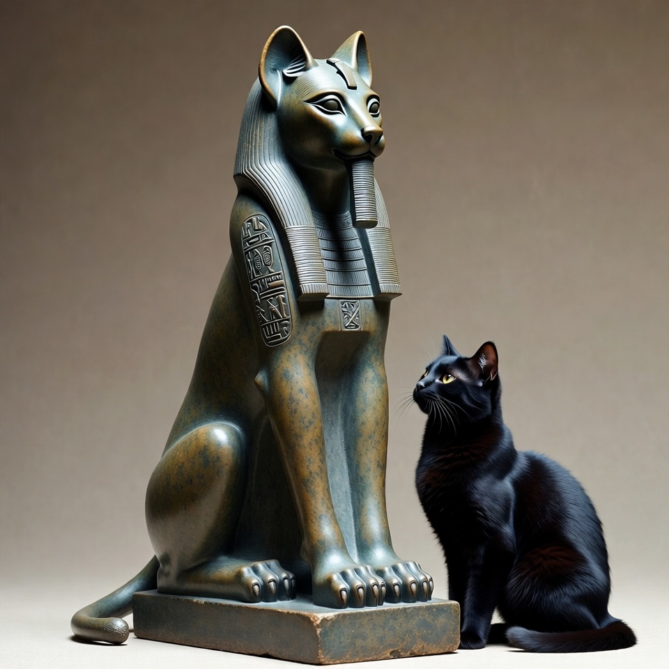 A large bronze Egyptian sphinx statue with intricate hieroglyphs sits on a base against a neutral background. A small black cat with green eyes sits beside the statue, looking towards it. The statue features a lion's body, cat head, and pharaoh headdress.