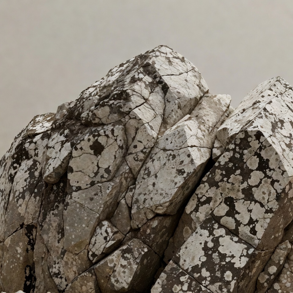 A tall, rugged rock formation rises against a foggy gray sky. The surface is cracked and textured with patches of white lichen clinging to the gray stone. Jagged edges and irregular shapes dominate the composition.