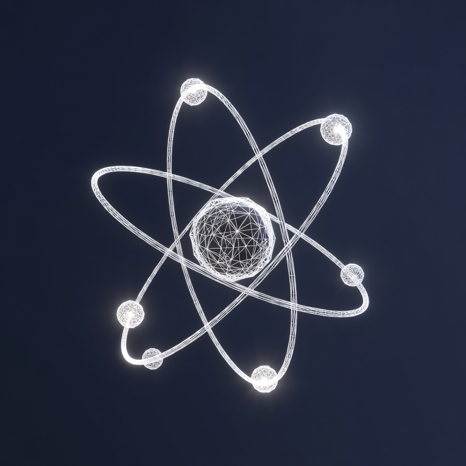 3D model, CGI, atomic model, chemistry, dark background, digital art, education, electrons, futuristic, glowing, illustration, isolated, molecule, nucleus, orbits, particle, physics, quantum, render, science, scientific, structure, transparent, wireframe, atom