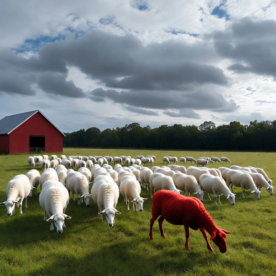 animals, barn, clouds, cloudy sky, colorful sheep, farm animals, field, grass, grazing sheep, green grass, livestock, outlier sheep, red barn, rural farm, sheep flock, sheep herd, sheep pasture, sky, trees, white sheep, red sheep