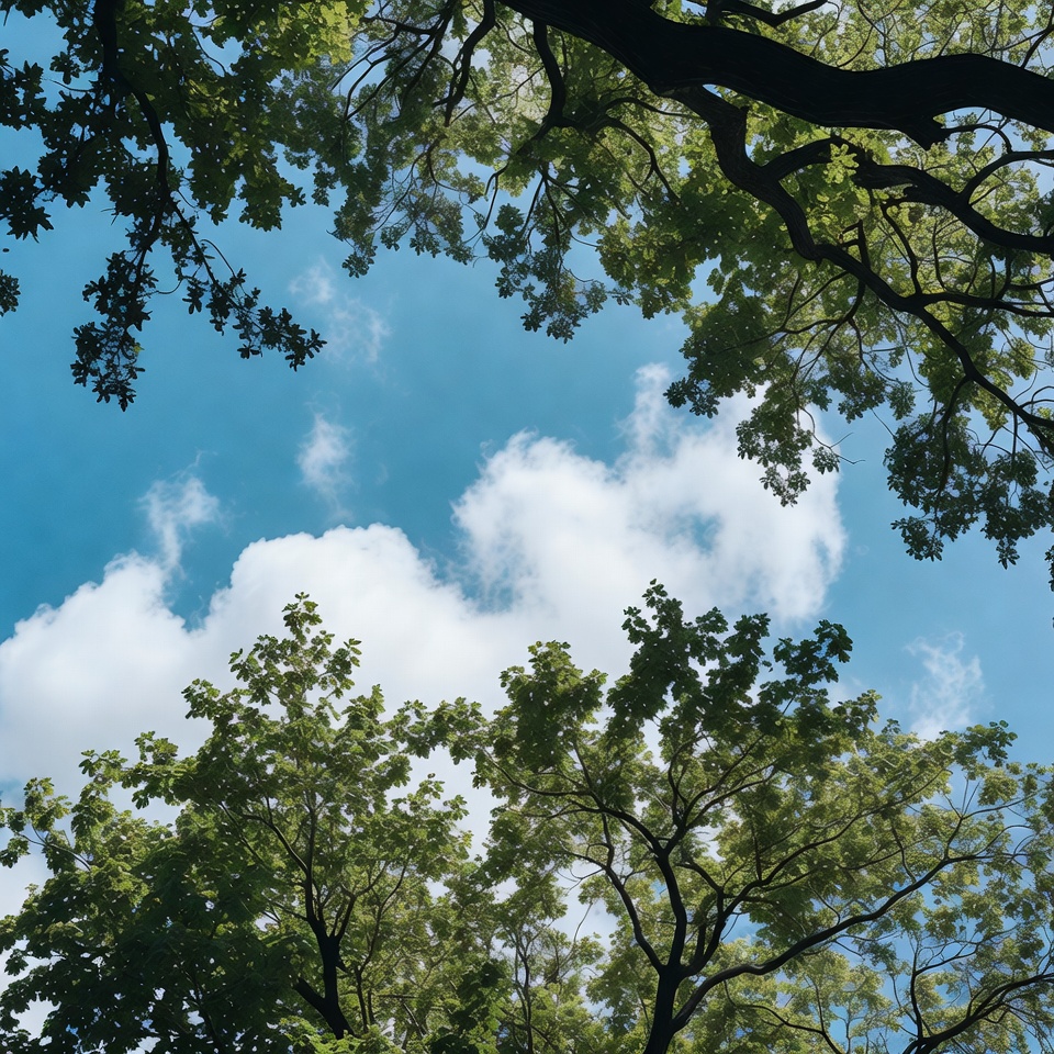 blue sky, branches, bright sky, canopy, clouds, foliage, forest, fresh, garden, green leaves, leaf patterns, leaves, lush, natural light, nature, outdoors, overhead view, park, sky, summer, sunlight, trees, white clouds, woodland, tree canopy