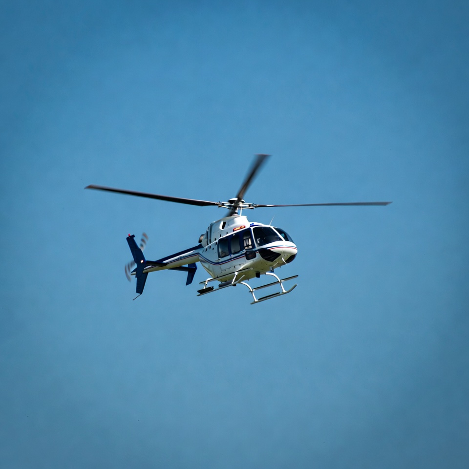 aerial vehicle, aircraft, aviation, blue sky, chopper, flying helicopter, isolated background, landing skids, rotors, white helicopter, helicopter