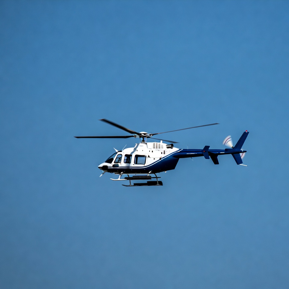 A white helicopter with blue accents and rotating blades flies against a clear blue sky. The aircraft features a sleek design with windows on the side and landing skids visible underneath. It is captured mid-flight with motion blur on the rotors.