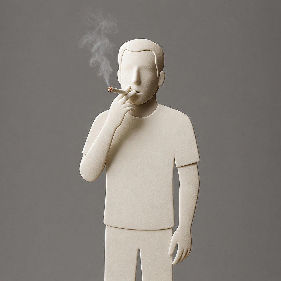 A minimalist white clay-like illustration of a man with short hair stands against a gray background, holding a cigarette to his mouth. He wears a simple white t-shirt and exhales a thin trail of smoke. The figure is stylized with smooth, featureless facial details.