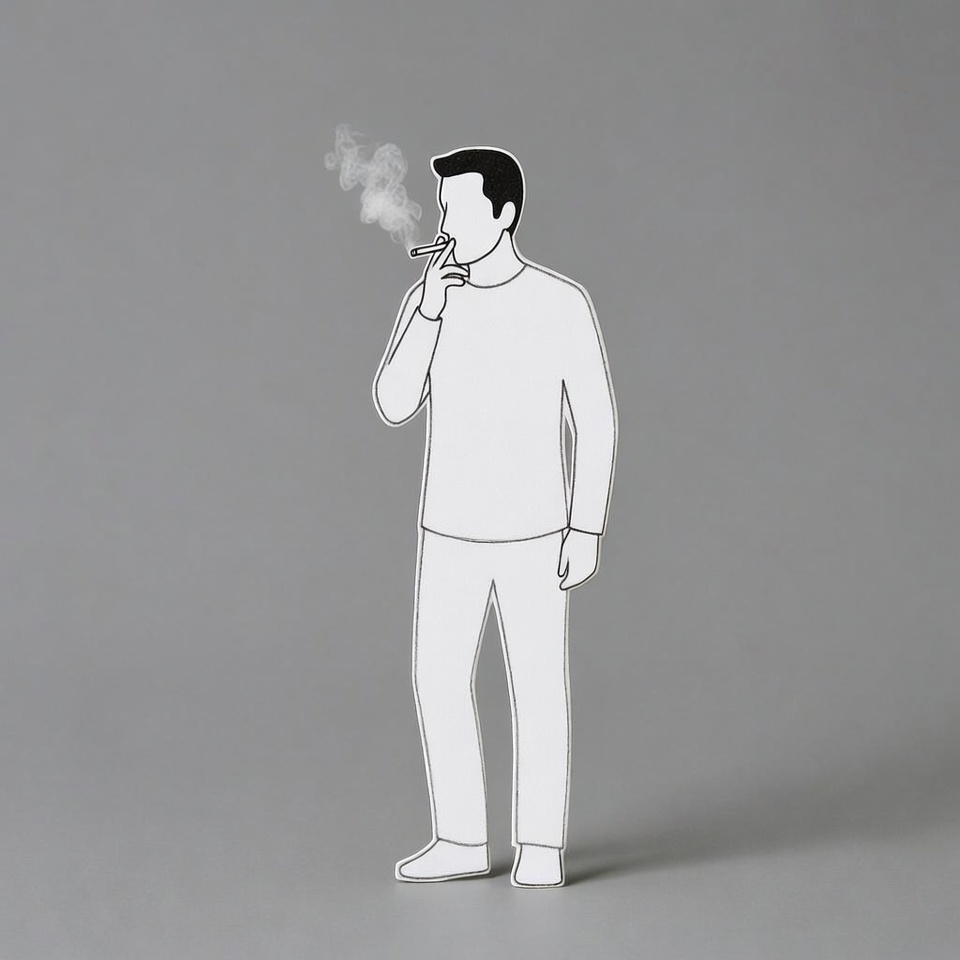 A black and white line art illustration of a man standing and smoking a cigarette. He holds the cigarette to his mouth with smoke rising from it. The figure wears a long-sleeved shirt and pants on a plain gray background.
