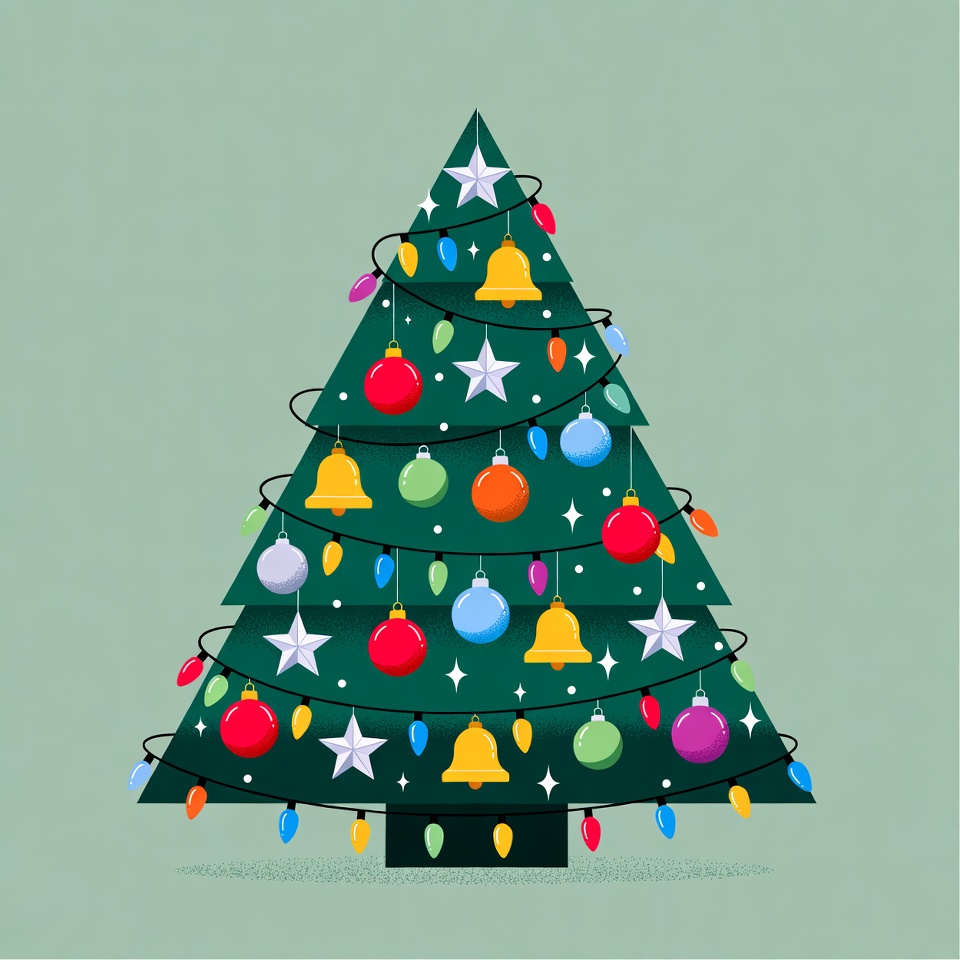 A vibrant green Christmas tree illustration features multicolored ornaments including red, blue, and purple balls, gold bells, and a large yellow star on top. Strings of lights wrap around the tree, adding festive glow. The tree stands centered on a light green background.