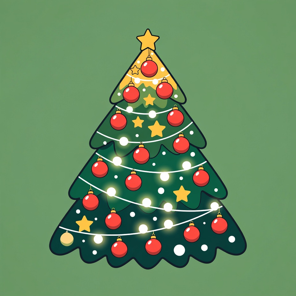 A vibrant green Christmas tree illustration features red ornaments, yellow stars, and white twinkling lights. The tree stands on a simple isolated background with a classic triangular shape. Decorative elements are evenly distributed across its branches.